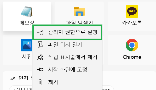 ◽ 메모장 실행 전, 우클릭 ➡ 관리자 권한으로 실행