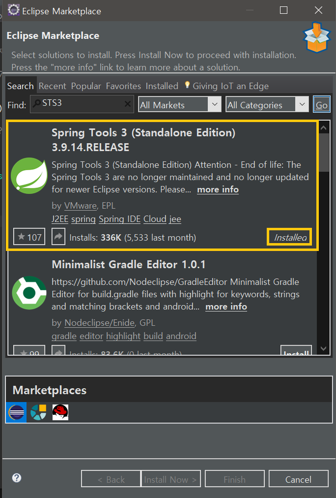 ·검색창에 'STS3' 검색 ➡ Spring Tools 3(Standalone Edition) install 하기