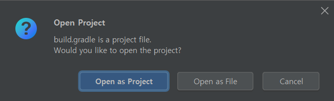 File ➡ New ➡ Open ➡ 압축 해제한 파일 안의 build.gradle 파일을 클릭한 뒤 OK를 누르면 아래와 같은 알림창이 뜬다.