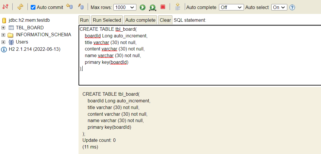 위의 쿼리를 H2 Database의 실행창에 작성하고 Ctrl + Enter 또는 위의 RUN 버튼을 클릭하면