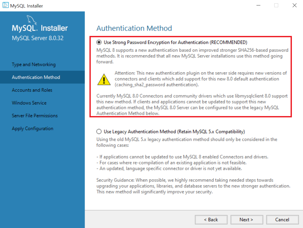 14 ) Server 파일의 권한을 결정하는 창이 떴다. 무슨 뜻인지 이해하기 위해 MySQL의 Documentation으로 들어가 확인해보니 MySQL의 서버 권한을 아래와 같이 설정한다는 뜻이었다. 그래서 나는 첫번째 기본 옵션을 선택한 뒤 설치를 진행했다.