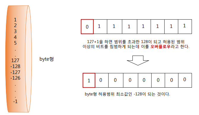 //결과 값은 오버플로우 처리가 되어서 127 + 1의 값은 범위를 벗어나는 128이 아닌 최소값인 -128로 나온다