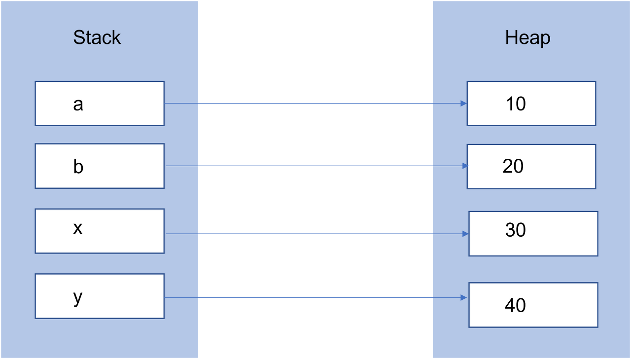 main() 메서드에서 변수 a와 b를 전달하지만 run() 메서드 내의 두 변수 x와 y는 a, b의 두 '값'만을 복사하여 x, y에 저장한다.