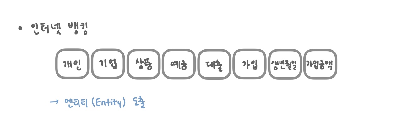 · 현행 업무를 파악하여 개념들을 정리하고 분류하여 엔티티(Entity), 속성(Attribute), 관계(Relationship)로 형상화하는 과정